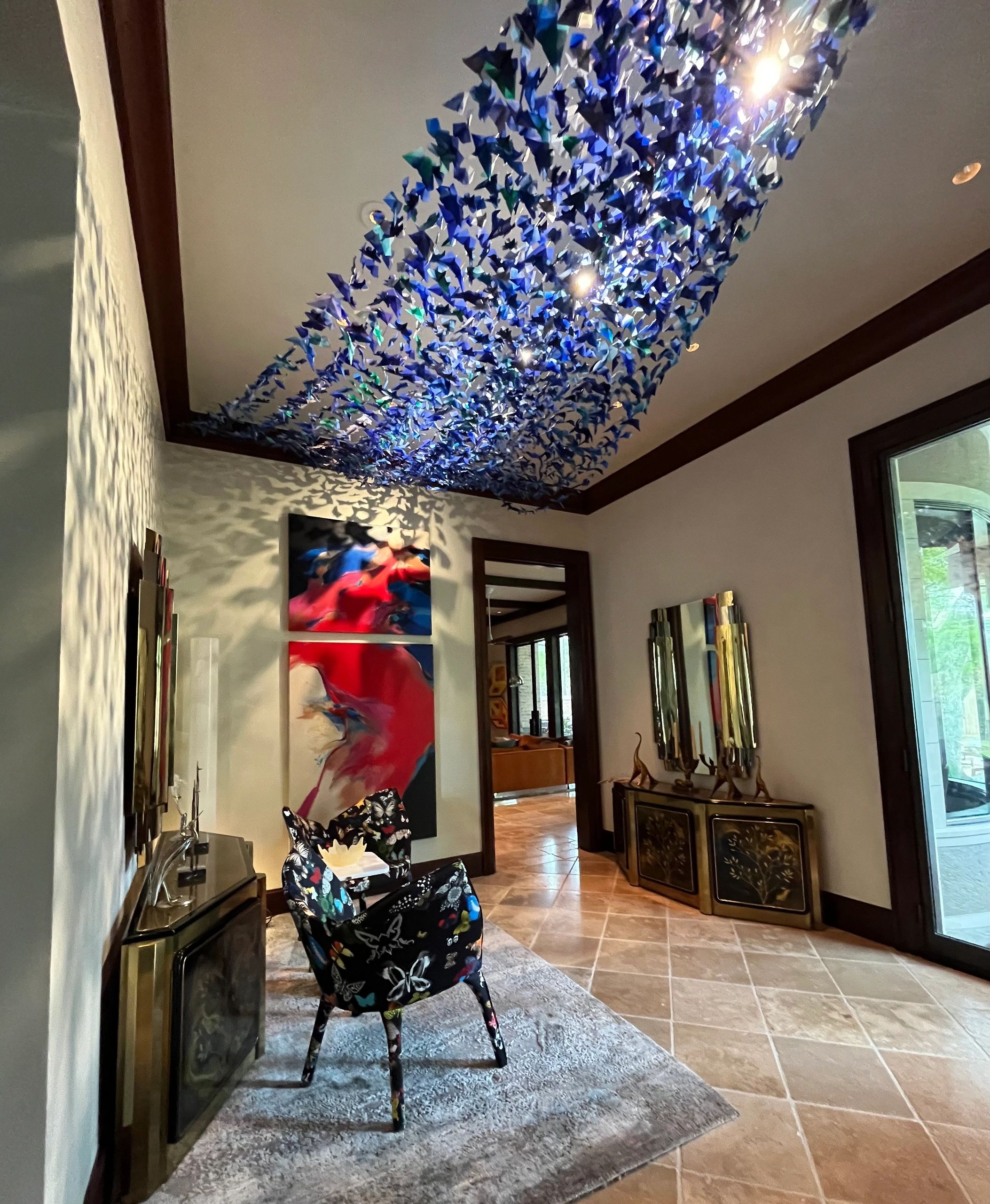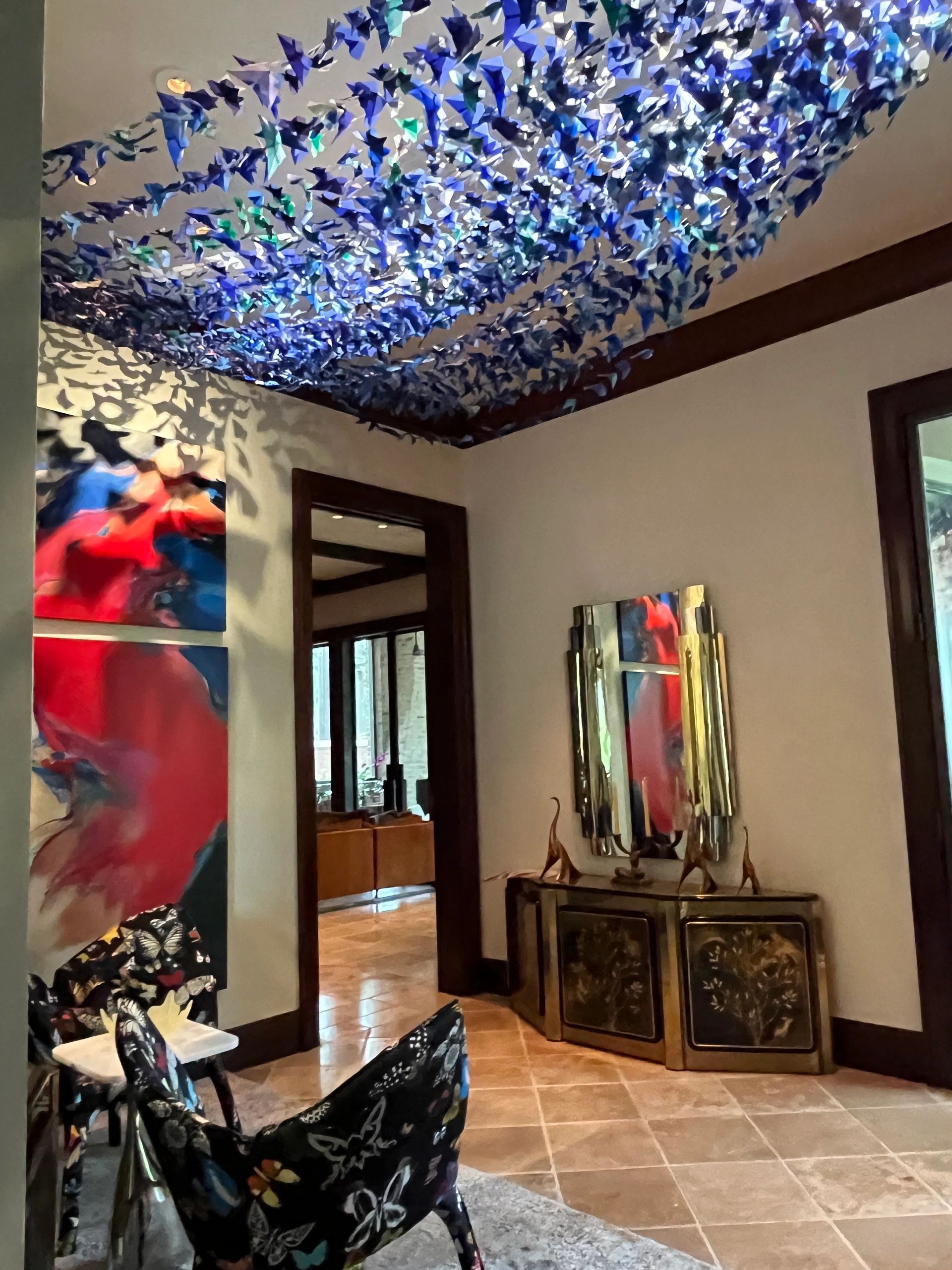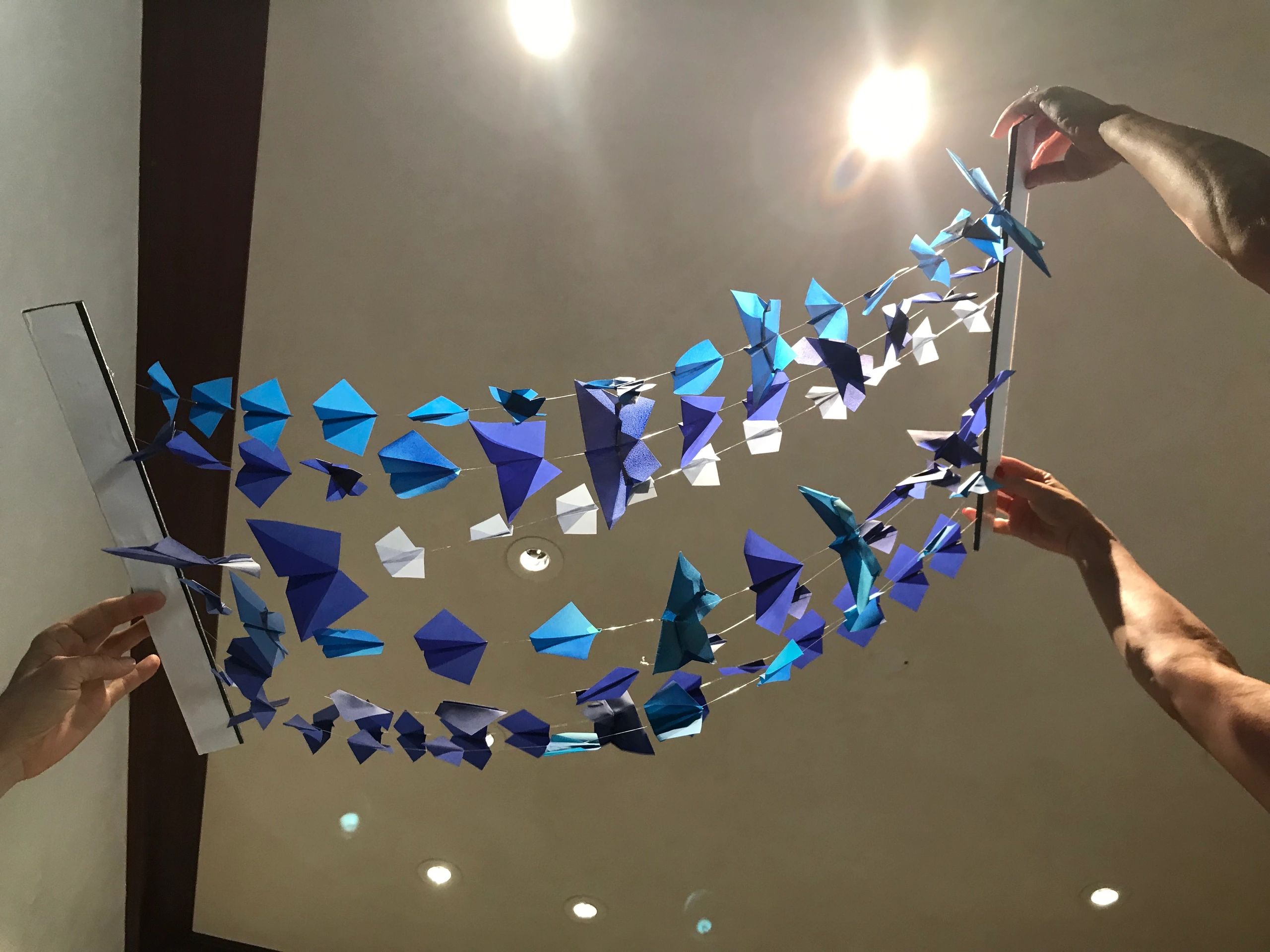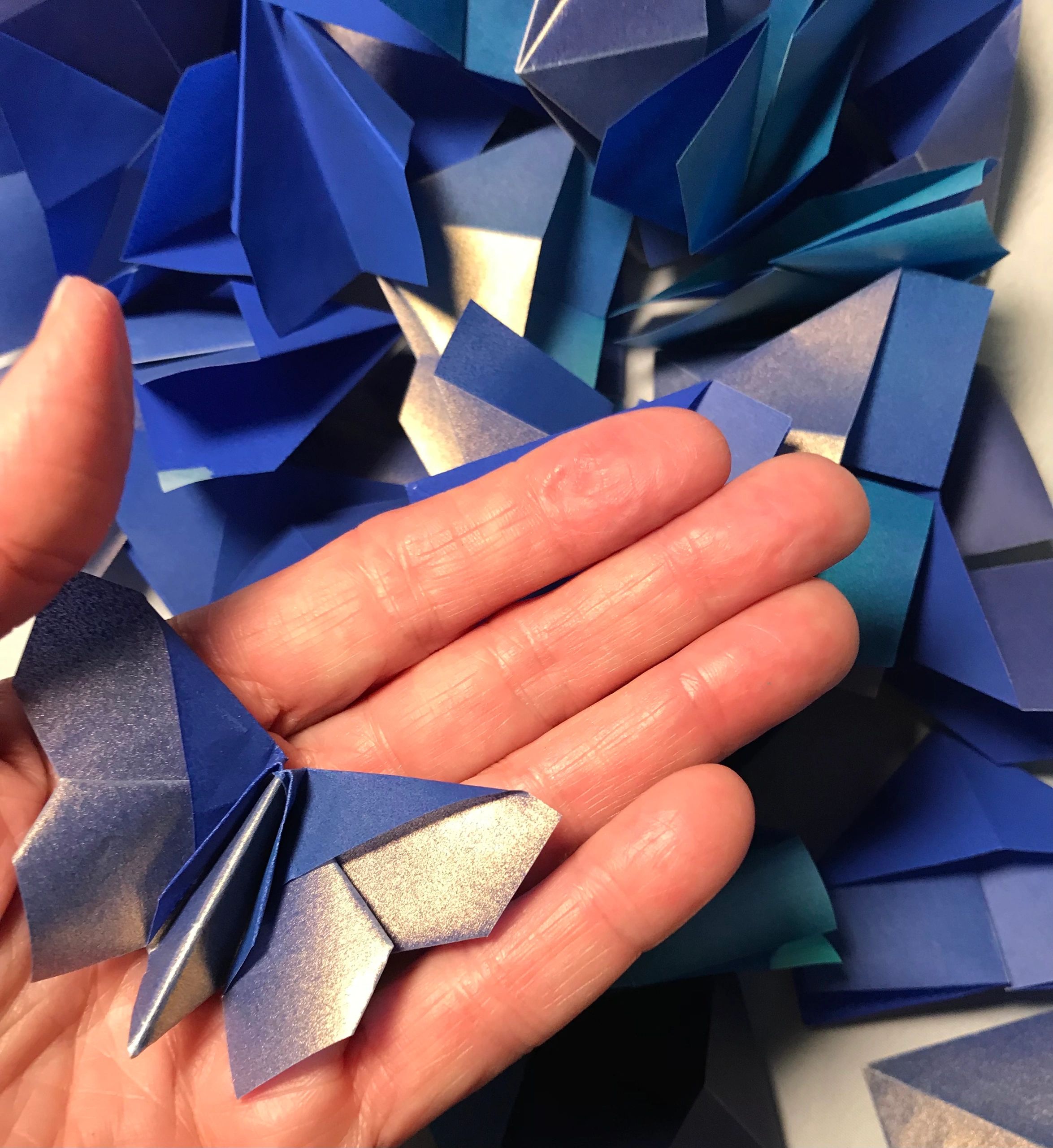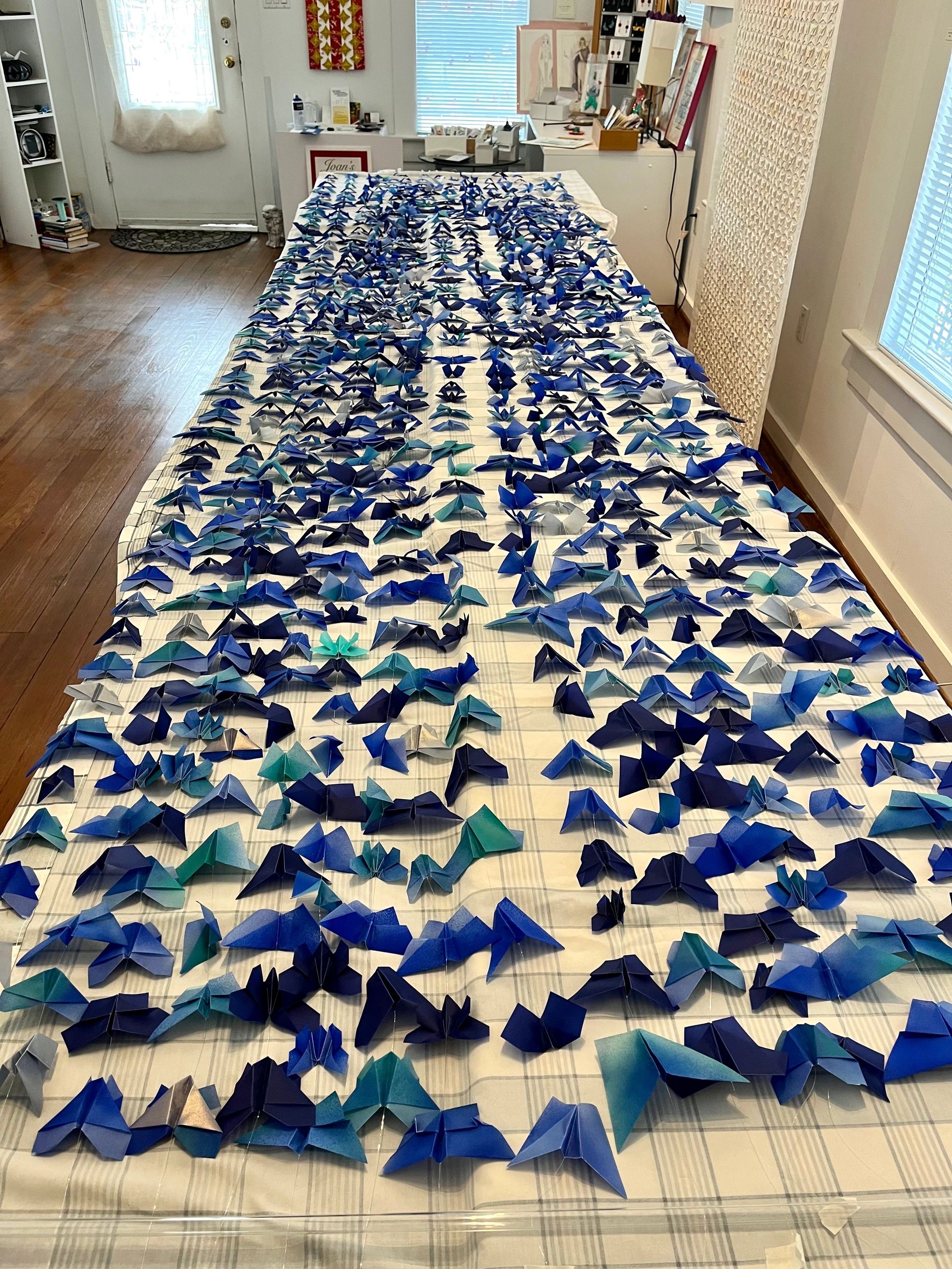 This is one panel with 16 strands of blue velum origami butterflies. Under construction in my studio. The final installation included nearly 3000 butterflies in three panels.